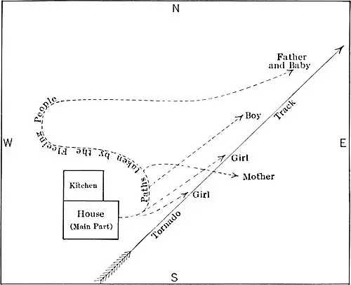 - ↑ The accompanying diagram illustrates a gruesome story. When the funnel cloud approached the house, the family fled. At first they ran northward, a direction of safety. Then, one after another, they turned eastward and ran into the whirl. The younger of two girls ran directly into the tornado path and was instantly killed. The mother had reached a place of safety; then she turned into the tornado path and was crushed to death against a tree trunk. The older girl and a boy also turned toward the storm track; their clothing was stripped from them and they were torn and bruised. The father, with the baby in his arms, had reached a place of safety; then, in fright, he too ran back into the storm track where both were killed. This is one story that illustrates many. As a rule, the path of safety is toward the northwest or the southeast if the direction of the tornado track can be determined.