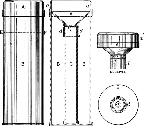 The standard Weather Bureau rain gauge is a cylindrical barrel of galvanized iron 26 inches in height over all. The receiver is a funnel with an upright collar of bronze 2 inches high. The edge of the collar is beveled so as to present a sharp cut-water to the rain. The receiver delivers the water to the measuring tube; a sleeve at the lower end of the funnel holds the mouth of the measuring tube in place and prevents the loss of water. The brass measuring tube, accurately calibrated, rests in a seat at the bottom of the barrel.