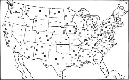 Mean annual rainfall of the United States: the figures expressed in inches of precipitation.