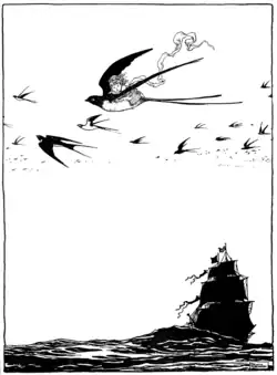 She brought the swallow water in a flower-petal and he drank, and then he told her how he had torn one of his wings in a thorn bush, and therefore could not fly fast enough to keep up with the other swallows who were all migrating to the warm countries. He had at last fallen to the earth, and more than that he could not remember; he did not at all know how he had got underground.