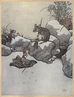 'Thou poor little thing!' said the field-mouse, who was indeed a thoroughly good-natured old creature, 'come into my warm room and dine with me.'