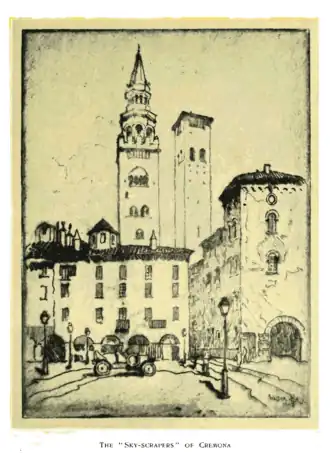 I suggested to the Illustrator that if he sketched vigorously they might stay and watch him, and while this failed in Brescia—the creatures climbing to the clock-tower he was drawing, and jeering at us—at Cremona he had developed a regular line of attack. Here in an open square he appealed to their sympathies. Since he was an old, old man, he turned to them for protection. He looked to them to draw a magic circle around his sketching-stool, and with horned fingers, centesimi, sweets, and main force keep the Italian public from the line of vision; while I, also very old, would rest in the motor-car which he so loved to put into his foregrounds. It was a pleasant relief; keeping clear the line of vision was generally my work. I grew fond of Cremona, basked in the sunshine, dozed a little perhaps—being a very ancient person—and was just dreaming that I heard the sounds of the far-famed violins, when an amazed signore called my attention to the unpleasant truth that the music—noise, forsooth—was the voice of the Illustrator, deserted by his body-guard, rendered helpless by the throng around him, and calling for assistance.