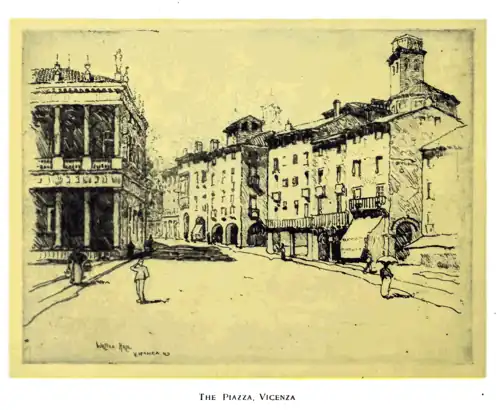 We blushed a blush of middle age, and drove them sternly to Vicenza; for Vicenza, the Illustrator had discovered (by peeking stealthily into the Shakespeare), was not known to the poet. It is a charming place, but the man, in his desperation, thought his assurances to the contrary might keep from them the truth. "It is a dull town," he kept repeating, cheerily—"a dull town, no winding ways, nothing but bare open places. I'll do one of them, and draw from the motor, so you can all three sit and watch me." He spoke of this as one would hold out peppermint sticks to schoolboys.