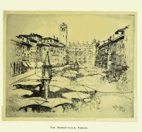 If the artist did not retain the young couple in his sketch the following morning, it was not for lack of a borrowed third story from which to watch them. I, as his faithful henchman, went with him, seeing to it that the children of the signora who loaned us the view did not sit upon the drawing-pencil. We were in a triumphant mood, inversely as the happy pair were subdued. They had elected to sit in the market-place below us and study the frescoes on the old palace facade; indeed, they had promised to do so. This was well, for it was a cloudy day and the umbrellas of the hucksters, which might have hidden them, were still furled. A day bad for shadows, but the subject was one worthy of a drawing at any time. Yet the Italian sun is hard to keep behind the clouds when there are lovers about. It crept out and beamed upon the two. A big umbrella was unfurled over a stand of artichokes—we grew uneasy; the green beans next received a shelter—we could hear the young couple laugh. They were near the cucumbers, and as the sun shone hotter this miserable vegetable was also engulfed. The opening up of the coverings became general, they stretched into a lumpy sea of canvas. Certain fishy people swam around under them, and up a side street. When the sketch was finished we went, as one man, and poked them down from Juliet's balcony.