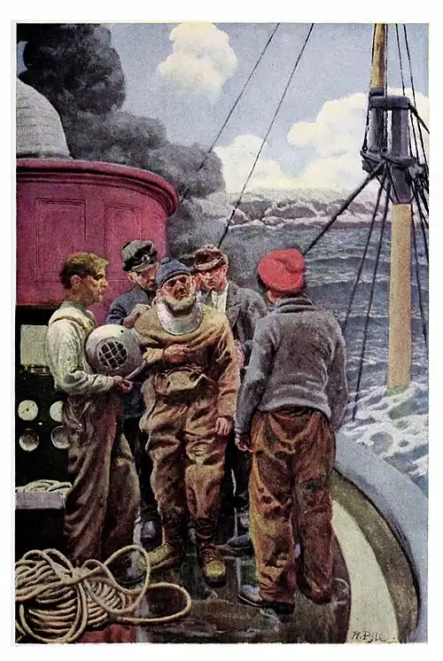 When I found myself better I made ready to go down again, for once you've promised to do a thing, there's nothin' but to do it. But just as they were about to slip my helmet on, me with my foot on the ladder, the chain that was holdin' her slipped again, and into two hundred fathom she went—too deep for any diver in this world ever to raise her.