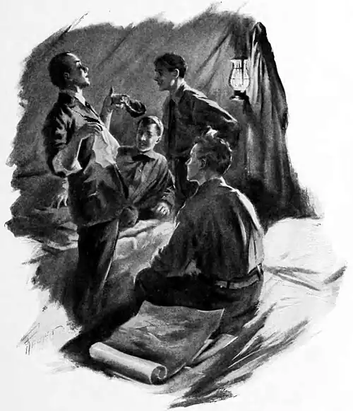 Supper was late that evening, for Dick had two extra persons to provide for, and it was incumbent, besides, to set a rather more elaborate repast than usual. But when it was ready it proved to be well worth waiting for, and the fricassee of beef was delicious. Dick had learned the trick from a ranch cook out West. The ranch cook used to call it “frigasy de boof,” but he made it much better than he pronounced it. After supper Billy Noon and the Doctor got into a spirited discussion on the subject of Early Elizabethan Drama, a subject which didn’t greatly interest the others after the first ten minutes. But taken in connection with one thing and another, including the marked map seen in the cabin, Billy Noon’s knowledge of the subject in discussion set the boys wondering harder than ever that night after the guests had taken their departures.