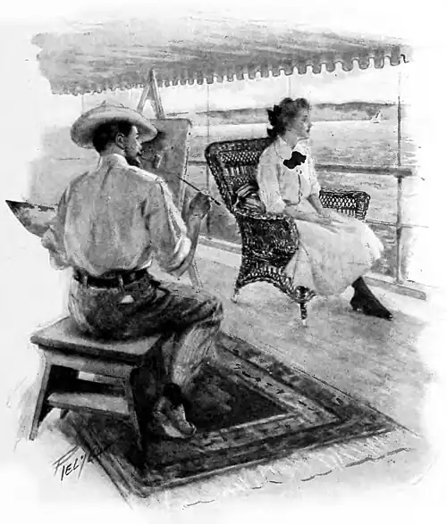 His voice trailed off into a murmur and Harry could hear the soft sound of the charcoal on the canvas, although, as her head was turned away, she could not see the rapid, deft strokes of his hand. It wasn’t hard for Harry to talk, and here was a fine opportunity. So she made the most of it for some little time, the artist throwing in an occasional word or question which, if not always especially apropos, encouraged the sitter to continue. But finally Harry noticed that the replies had ceased and so she allowed the one-sided conversation to lapse. She was getting rather tired of looking at the shore, across the dazzling river, and her neck was beginning to feel stiff; also her hands simply wouldn’t keep still in her lap. Unconsciously she emitted a deep sigh and the man at the easel heard it, looked up quickly, smiled, and: