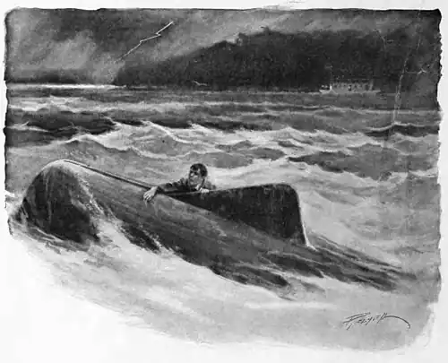 “Look!” he cried. “There! It’s a boat bottom-up with a man clinging to it! Can you see?”