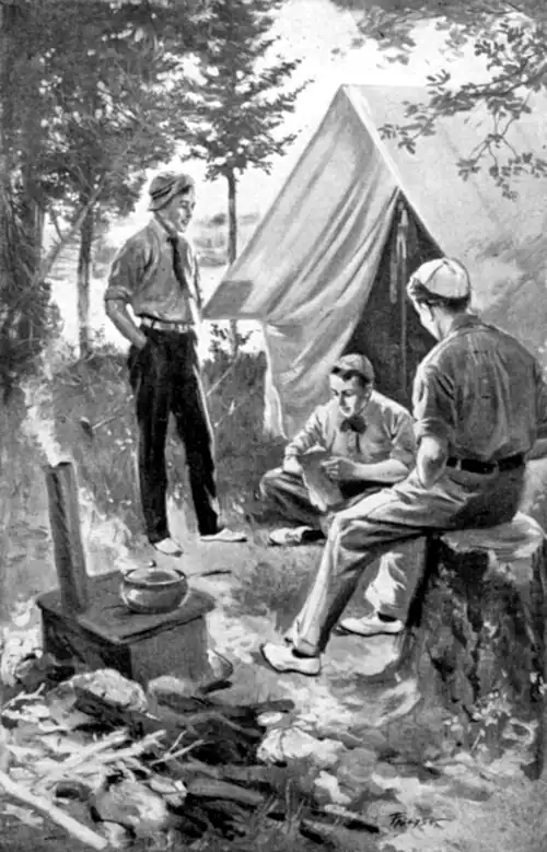 They brought the tent and poles up and, under the direction of Dick, who was quite in his element now, soon had them erected. Dick showed them how to drive the pegs in a line with the guy-ropes instead of at an angle, so that the straining of the tent in a wind would not loosen them. The tent was not a new one, as several patches proved, but it was made of good heavy duck and was quite tight. It was a wall tent, twelve by eight feet in size, and there was a shelter curtain which could be raised over the doorway. Chub called it the porch roof. Then they had brought a third piece of canvas which could be stretched over the little sheet-iron stove on rainy days. Dick, who had volunteered to do the cooking, selected a site for the “kitchen,” and, while the others went off for pine branches for the beds, he set up the stove. After the boughs were placed in the tent and the blankets spread over them they scooped out a trench around the outside of the tent to drain off the water in case of a heavy rain. Then the boys separated in search of firewood, Roy looking for dead branches in the “forest” and Chub and Dick going to the upper end of the island. Chub took the canoe and Dick the rowboat, and by the time they had met, after having paddled along opposite shores, each had accumulated a respectable quantity of driftwood. Much of it was too wet to burn, and so when they got back to camp they spread it out in the sun. Roy had meanwhile made several trips into the woods and a good-sized heap of dry branches lay beside the stove.