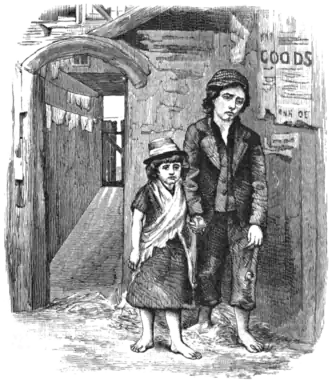 This, however, seemed no matter of surprise to Benny and little Nell, who wended their way without difficulty along the rough, ill-paved street. At length they turned up a narrow court, darker and dirtier even than Bowker's Row, which went by the name of "Addler's Hall." About half-way up this court they paused for a moment and listened; then, cautiously pushing open a door, they entered the only home they had ever known.
