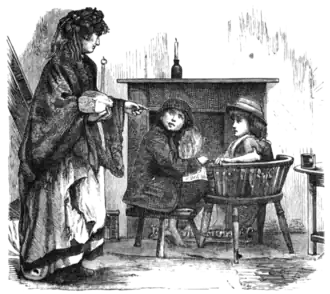 Outside, the wind moaned and wailed, and whistled through the keyhole and the chinks in the door, and rattled the paper and rags with which the holes in the window were stopped. And as the children listened they shivered, and drew closer together, and nearer the fire.