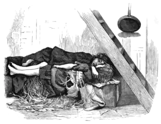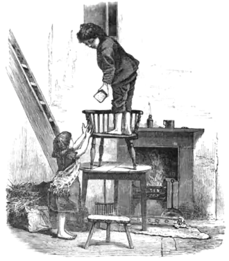 The furniture consisted of a three-legged round table, a chair minus a leg, and a three-legged stool. On the window-sill there was a glass bottle with a candle stuck in the neck, and under the stairs there was a heap of rags and shavings, on which Benny and his sister slept. A frying-pan was suspended against the wall near the fireplace, and several cracked cups and saucers, together with a quart mug, stood on the table. The only other article of furniture was a small cupboard in a corner of the room close up to the ceiling, placed there, no doubt, to be out of the way of the children.