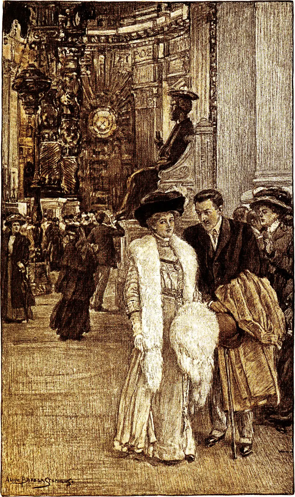They came to a chapel where the mass was being said, and stood among the crowd of those who stood and knelt outside the stone balustrade. Within the chapel sat the officiating priests, some of them with strong hard faces, some with weak sensual ones, and all of them looking bored. From their midst, as they dozed, or took snuff, or yawned behind their hands, came a mechanical chanting, a dry sound which seemed to proceed almost automatically. Anne wondered at such a spectacle, as existing presumably for the two-fold purpose of glorifying God and lifting the spirit of man towards Him, and again she wished to share her impression with the man beside her; but he had neither thoughts nor words for anything but her relation to himself. His voice came to her through the chanting:—