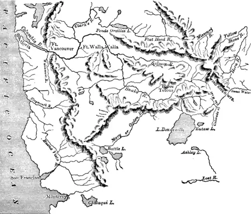 - ↑ There are those who soberly refer to the Baron la Hontan and his prodigious falsehoods of 1689 for the first information of Great Salt Lake. Because among the many fabulous wonders reported he somewhere on the western side of the continent placed a body of bad-tasting water, Stansbury, Exped., 151, does not hesitate to affirm 'that the existence of a large lake of salt water somewhere amid the wilds west of the Rocky Mountains seems to have been known vaguely as long as 150 years since.' Perhaps it was salt, and not silver that the Winnebagoes reported to Carver, Travels, 33–6, as coming down in caravans from 'the mountains lying near the heads of the Colorado River.' Warren, in Pacific Railroad Report, xi. 34, repeats and refutes the La Hontan myth. He says, 'the story of La Hontan excited much speculation, and received various additions in his day; and the lake finally became represented on the published English maps.' Long before this date, however, reliable information had been received by the Spaniards, and the same may have come to English trappers; so that by 1826 reports of the existence of such a sheet may have reached civilization. It is needless to say that neither La Hontan nor Carver ever received information from the natives, or elsewhere, sufficient to justify map-makers in placing a large lake in that vicinity. In Gordon's Historical and Geographical Memoir of the North American Continent, published in Dublin in 1820, it is written: 'Concerning the lakes and rivers of this as yet imperfectly explored region we have little to say. Of the former we have no certain account. Two have been noticed in the western parts, a salt lake about the thirty-ninth degree of latitude, the western limits of which are unknown, and the lake of Timpanogos, about the forty-first degree, of great but unascertained extent.'In a report submitted to congress May 15, 1826, by Mr Baylies it is stated that 'many geographies have placed the Lake Timpanogos in latitude 40, but they have obviously confounded it with the Lake Theguayo, which extends from 39° 40' to 41°, and from which it appears separated by a neck or peninsula; the two lakes approaching in one direction as near as 20 miles.' 19th Cong., 1st Sess., House Rept. No. 213. Such statements as this amount to nothing—the honorable gentleman, with all due respect, not knowing what he was writing about—except as going to show the vague and imperfect impression of the popular mind concerning this region at that time.I will give for what it is worth a claim, set up in this same congressional report, by one Samuel Adams Ruddock, that in the year 1821 he journeyed from Council Bluff to Santa Fé, and thence with a trading party proceeded by way of Great Salt Lake to Oregon. The report says: 'On the 9th of June this party crossed the Rio del Norte, and pursuing a north-west direction on the north bank of the river Chamas, and over the mountains, reached Lake Trinidad; and then pursuing the same direction across the upper branches of the Rio Colorado of California, reached Lake Timpanagos, which is intersected by the 42d parallel of latitude, the boundary between the United States of America and the United States of Mexico. This lake is the principal source of the river Timpanagos, and the Multnomah of Lewis and Clarke. They then followed the course of this river to its junction with the Columbia, and reached the mouth of the Columbia on the first day of August, completing the journey from the Council Bluffs in seventy-nine days.'