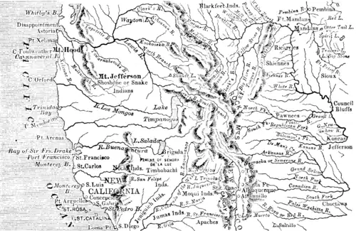 - ↑ Jedediah Smith in 1826 calls the lake Utah, and the stream fowing into it from the south Ashley River. 'Je traversai le petit lac Utâ, et je remontai le cours de l'Ashley qu'il reeoit.' Extrait d'une lettre, in Nouvelles An. des Voy., xxxvii. 208. For an account of this journey see Hist. Cal., this series, where are fully discussed the several conflicting authorities. Warner's Ren., MS., 21-9, dates the journey 18:24, and carries the company from Green River, south of Salt Lake, and over the mountains near Walker Pass. Accounts in Cronise's Nat. Wealth Cal.; Hutchings' Mag., v. 351-2; S. F. Times, June 14, 1807; Randolph's Oration, 313-14; Tuthill's Hist. Cal., 124–5; Frignet, La Californie, 58–60; Douglas' Private Papers, MS., 22 ser. i.; Victor's River of the West, 34; Hines' Voy., 110, are mentioned.