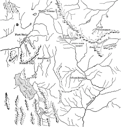 While the party were slowly descending Bear River four of them rode over to Fort Hall to obtain if possible a “pilot to conduct us to the gap in the California Mountains, or at least to the head of Mary's River,” and to make inquiries of Mr Grant, then in charge. No guide could be found, and Grant was not able greatly to enlighten them. The fur-trader could have told them much concerning the route to Oregon, but this way to California as an emigrant road had hardly yet been thought of.
