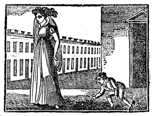 As the footman was very fond of reading, he used generally in the evening to entertain his fellow-servants, when they had done their work, with some amusing book. The pleasure our little hero took in hearing him made him very much desire to learn to read too; so the next time the good-natured footman gave him a half-penny, he bought a horn-book with it; and with a little of his help, Dick soon learned his letters, and afterwards to read. About this time, Miss Alice was going out one morning for a walk: and the footman happening to be out of the way, little Dick, who had received from Mr. Fitzwarren a neat suit of clothes, to go to church on Sundays, was ordered to put them on and walk behind her. As they walked along, Miss Alice, seeing a poor woman with one child in her arms, and another at her back, pulled out her purse, and gave her some money; and as she was putting it again into her pocket, she dropped it on the ground, and walked on. Luckily Dick, who was behind, saw what she had done, picked it up, and immediately presented it to her.