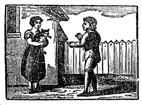 Poor Whittington's cat, besides being an excellent mouser, had all the sportive talents of her tribe. Whence, as soon as her master found himself perfectly freed from his late tormentors, he began to call them into exercise; and accordingly having received a few lessons only, Puss would creep into his pocket like a squirrel, follow him as far as he would permit her, and like a little puppy dog, jump over his hands at command. In a word, she became as lively and entertaining a companion, as she had proved herself to be a useful one, and was the whole solace of his life. In one of these happy moments, for they were the only happy moments he ever enjoyed, out of his kind master and mistress's presence, he was at length surprised by his young lady; for cook being gone out, he forgot to guard against other visitors; and, at his young mistress's request, Puss went through all her pretty manoeuvrings, with equal honour to herself and her master.