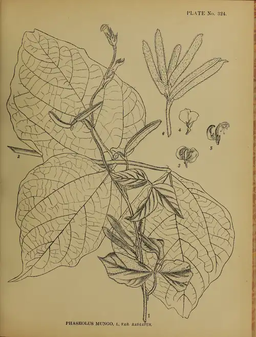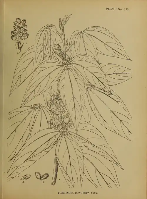 A robust, erect annual, 2-3 ft. high, clothed with adpressed grey hairs attached by the middle. Leaves 3-foliate. Leaflets l½-3 by ½-2in., elliptic, acute, sharply dentate (the teeth generally ending in a weak spine, clothed on both sides with adpressed medifixed hairs, base acute ; main nerves prominent. Petiolules of the lateral leaflets 1/8 in., those of the terminal ones 1/4-½in. long. Petioles 1-1½ in. long, sparsely hairy. Stipules l/4-3/8in. long, linear setaceous, subulate persistent. Flowers small, 6-30in. copious, close, short-peduncled, axillary, close racemes ; pedicels short, hairy ; bracts linear-subulate, persistent, 3/16 in. long. Calyx hairy outside, 1-1/4 in. long to the extremity of the longest tooth ; teeth very unequal, the lowest two the longest linear-subulate, the upper 3 shorter, triangular, acute. Coralla slightly longer than the Calyx ; standard slightly orbicular. Anthers uniform, apiculate. Ovary sessile ; many-ovulate ; style incurved at apex ; stigma capitate. Pod thick, fleshy, straight, sub-tetragonal, 1½-2in. long, slightly pubescent. Seeds 5-6, square, slightly compressed. Use :— Its stem and leaves appear to be officinal under the above name (Stewart). Pods used as a vegetable among the Hindus.