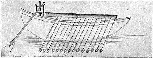 Dr. Fryer, who visited India about the year 1674, has also left some interesting details about Indian ships and boats. He describes the Mussoola as "a boat wherein ten men paddle, the two aftermost of whom are the steersmen, using their paddles instead of rudder: the boat is not strengthened with knee-timber, as ours are; the bended planks are sewed together with rope-yarn of the cocoe and caulked with dammar (a sort of rosin taken out of the sea) so artificially that it yields to every ambitious surf."[14] He describes catamarans as formed of "logs lashed to that advantage that they waft all their goods, only having a sail in their midst, and paddles to guide them." Dr. Fryer was landed at Masulipatam by one of the country boats, which he describes as being "as large as one of our ware-barges and almost of that mould, sailing with one sail like them, but paddling with paddles instead of spreads, and carry a great burden with little trouble; outliving either ship or English skiff over the bar."