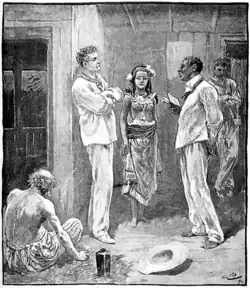 When these two traders came aboard I was pleased with the looks of them at once, or, rather, with the looks of both, and the speech of one. I was sick for white neighbors after my four years at the line, which I always counted years of prison; getting tabooed, and going down to the Speak House to see and get it taken off; buying gin and going on a break, and then repenting; sitting in the house at night with the lamp for company; or walking on the beach and wondering what kind of a fool to call myself for being where I was. There were no other whites upon my island, and when I sailed to the next, rough customers made the most of the society. Now to see these two when they came aboard was a pleasure. One was a negro, to be sure; but they were both rigged out smart in striped pajamas and straw hats, and Case would have passed muster in a city. He was yellow and smallish, had a hawk's nose to his face, pale eyes, and his beard trimmed with scissors. No man knew his country, beyond he was of English speech; and it was clear he came of a good family and was splendidly educated. He was accomplished too; played the accordion first rate; and give him a piece of string or a cork or a pack of cards, and he could show you tricks equal to any professional. He could speak, when he chose, fit for a drawing-room; and when he chose he could blaspheme worse than a Yankee boatswain, and talk smart to sicken a Kanaka. The way he thought would pay best at the moment, that was Case's way, and it always seemed to come natural, and like as if he was born to it. He had the courage of a lion and the cunning of a rat; and if he's not in hell to-day, there's no such place. I know but one good point to the man—that he was fond of his wife, and kind to her. She was a Samoa woman, and dyed her hair red—Samoa style; and when he came to die (as I have to tell of) they found one strange thing—that he had made a will, like a Christian, and the widow got the lot; all his, they said, and all Black Jack's, and the most of Billy Randall's in the bargain, for it was Case that kept the books. So she went off home in the schooner Manu'a, and does the lady to this day in her own place.