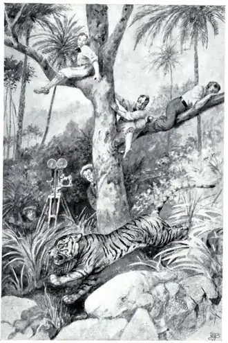 At the head of this tiger-hunting expedition went the great circus-wagon containing the tigress's cage. This was followed by Joie, with Ali and Sahib Anderson on his back. Also another larger elephant was taken along to help in beating the jungle, and for effect in making the moving-picture.