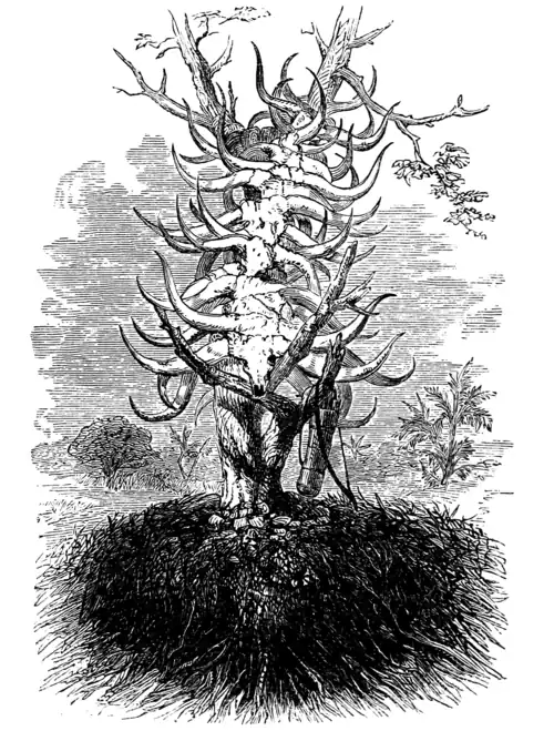 The tree from which the Damaras are descended is to be seen, they say, at a place called Omaruru. But somehow there must be more than one parent tree, for both in going and coming we met with several Omumborombongas, all of which the natives treated with filial affection.[4]