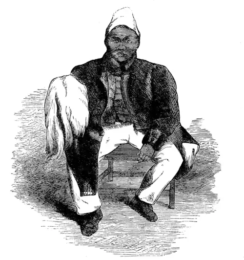 Being desirous of obtaining a likeness of so famous a personage as Afrikaner, I requested him one day to put on this costume and allow me to take his portrait. He good-naturedly consented to my solicitation, and on the following morning appeared duly appareled. We rather expected to have a laugh at him, since his gait and figure were somewhat unprepossessing; but we were disappointed. He marched up to his seat with as much ease and dignity as if he were familiar with the usage of courts.