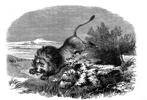 But as it seemed to me that the "beaters" were timid, and, moreover, somewhat slow in their movements, I called them back, and, accompanied by only one or two persons, as also a few worthless dogs, entered the brake myself. It was rather a dangerous proceeding; for, in places, the cover was so thick and tangled as to oblige me to creep on my hands and knees, and the lion, in consequence, might easily have pounced upon me without a moment's warning. At that time, however, I had not obtained any experimental knowledge of the old saying, "A burnt child dreads the fire," and therefore felt little or no apprehension.