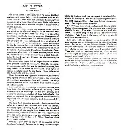 But Anarchists insist that all organization for whatever purpose should be voluntary. With the co-operative commonwealth they are in perfect harmony, but they insist that it must be voluntary. The right to ignore the state must be its basis. Upon this point the Anarchists will not yield.