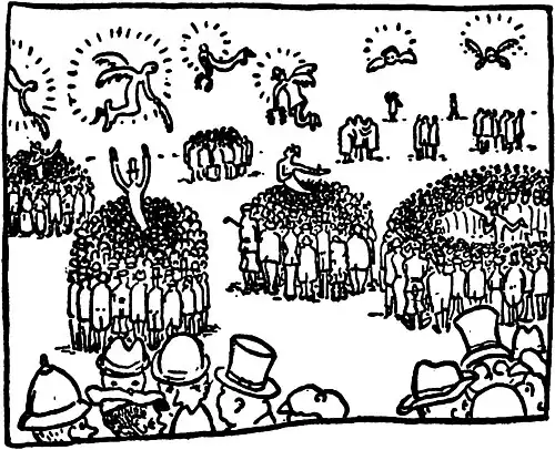 It was a large open space, and anyone who like to, can bring along a chair or a platform or nothing at all, and can start talking. After awhile he has five or twenty or three hundred people listening to him; they answer him, raise objections, nod their heads and some times they join the orator in singing sacred or profane hymns. Sometimes an opponent gets the people on to his side and begins to hold forth on his own; sometimes the crowd divides by a mere splitting and swelling like the lowest organisms and cell colonies. Some clusters are of a firm and steadfast consistency, others perpetually crumble and overflow, increase in size, become distended, multiply or scatter. The larger churches have perambulating pulpits, but most of the orators simply stand on the ground, suck at a moist cigarette and preach about vegetarianism, about God, about education, about reparations, or about spiritualism. Never in my life have I seen anything like it.