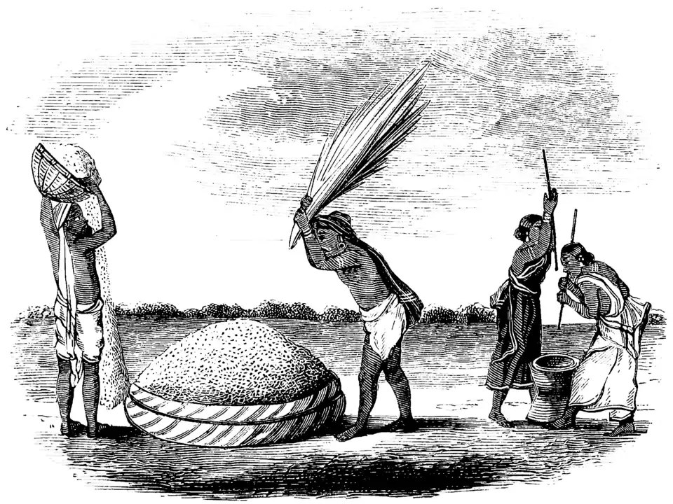 against the floor, (a mode which I have not seen practiced,) while another fans it by pouring it from a basket in the open air. Two women on the right are busily pounding the grain in a mortar, to separate the chaff from the rice.
