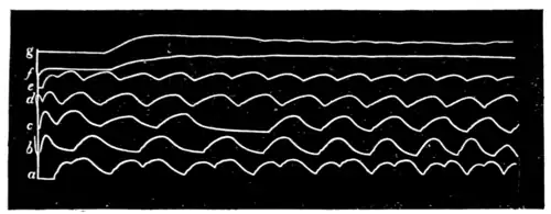 Let us begin by sending a very few shocks per second to the nerve. This we can do by using the spring at its full length, thus causing it to vibrate slowly. You see the muscle twitching each time the spring dips into the mercury and comes out again, and we get a curve in which the separate contractions can be seen (see Fig. 33, b, c, d, e). But already, you will observe, the contractions are, as it were, piled upon each other, f. Thus the muscle contracts with the first shock; then it begins to relax; but before it has had time to relax it again receives a shock, and it again contracts. Then it again relaxes; but it does not relax so much as before, ere it receives the third shock, and