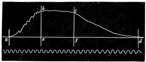 Fig. 36.—Curve showing production of tetanus. a to b, result of first shock; then observe the cumulative or gathering-up effect of the successive shocks as shown by gradual ascent of line from b to c; stoppage at e of shocks; e f, gradual relaxation.