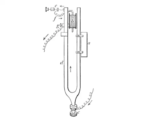 Fig. 39.—Tuning-fork arranged for causing a smoked-glass plate, a, to vibrate, b, electro-magnet; current passes in at c, along limb of fork, d, along platinum wire to platinum contact at e, thence by wire, f, to electro-magnet, b, thence back to battery by wire from g. When b is magnetised the limbs of the fork are drawn together and contact is broken at e. The limbs then fly back and again make contact at c, and so on.