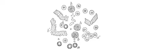 Fig. 41.—Drop of human blood. a, coloured or red corpuscle, showing clear spot in centre, or a′, dark spot in centre, according to focus; b, b, b, colourless corpuscles, or leucocytes; b′, red corpuscles in rouleaux. 300 diameters.