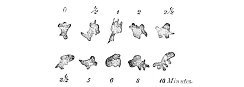 Fig. 42.—White blood corpuscles in frog's blood, magnified 560 times. Changes of form observed during ten minutes. Numbers represent minutes from the beginning of the experiment.