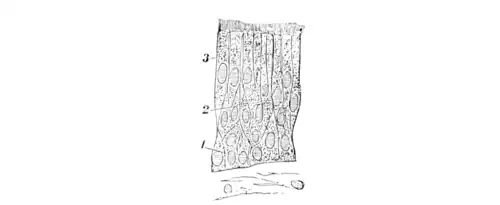Fig. 43.—Stratified ciliated epithelium. 1, oval; 2, spindle-shaped; 3, cylindrical cells, magnified 560 diameters. From the lining of the nose in the respiratory region.