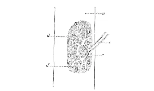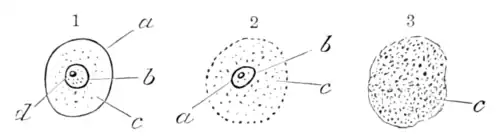 Fig. 44.—1. Original conception of a cell, a, cell wall; b, nucleus; c, cell substance or cell contents; d, smaller body, called a nucleolus. 2. Cell wall has disappeared, b, nucleus; c, nucleolus; c, cell substance or contents. 3. Modern view. Cell now consists of granular matter often showing a delicate network of fine fibres.
