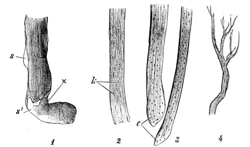 Fig. 46.—striated muscle of frog. 1, effects of water ; s s′, sarcolemma. 2, action of acetic acid, showing nuclei at k. 3, action of caustic potash. 4, branched muscle-fibre from the tongue. All magnified about 50 diameters.