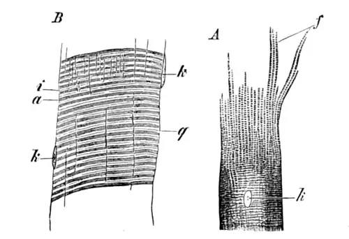 Fig. 47.—B, human muscular fibre magnified 560 times showing the light and dark hands; k, nuclei; g, Dohie's line. A, the end of the muscular fibre of a frog magnified 240 times splitting into fibrils, f; k, nucleus.