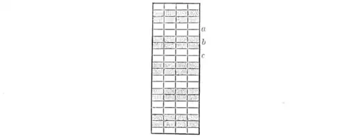 Fig. 48.—Diagram showing hypothetical views as to the structure of striated muscle. Four fibres side by side, a, clear bands or discs, each formed of two clear bands or discs, termed the lateral discs of Engelmann, separated by a thin dark line or band, known as Dobie's line, or Krause's membrane; b, two discs of dark substance, forming the sarcous elements of Bowman, having in the centre an ill-defined band or line, the median disc of Hensen; a is singly and b is doubly refractive as regards light.