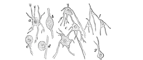 Fig. 50.—Various forms of nerve-cells. a, multipolar, from the gray matter of the spinal cord; b, d, bipolar, from ganglia on posterior roots of spinal nerves; c, g, from cerebellum; e, union of three cells; f, union of cells by processes.