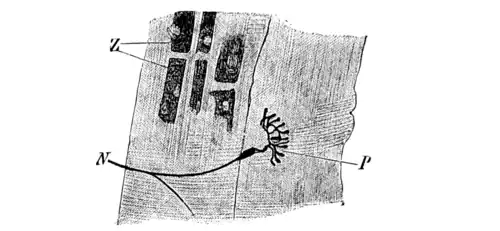 Fig. 51.—Motor nerve-ending from the muscular fibre of the intercostal muscle (muscle between the ribs) of a hedgehog. N, nerve; P, end-plate; Z, flat connective tissue-cells.