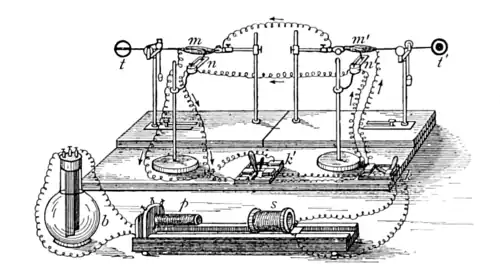 you are now familiar, and I have made arrangements for opening and closing the primary circuit of the induction machine by means of a long flat spring. Here is the battery. Let us follow the wire leading the current from the positive pole of the battery to the primary coil. Then the current passes through the coil and out by this wire to a little cup containing mercury. When the needle on the under surface of the end of the spring dips into the mercury, the current will pass through the mercury, along the spring, and then, by this other wire, back to the battery, entering it at the negative pole. I have also interpolated an electro-magnetic signal in the circuit, so that each vibration of the spring is also registered on the plate of the railway myograph.