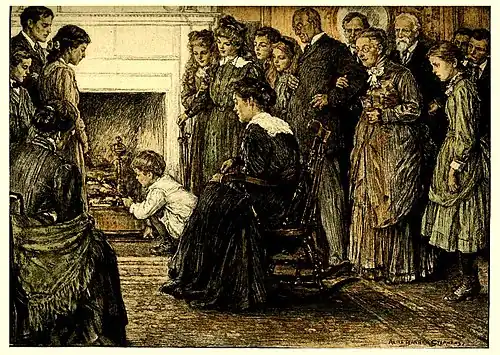 Water flowed freely through Cousin Ann's expensive pipes, that had been buried so deep in their trenches that the winter frosts could not affect them. Natty Harmon tried the kitchen pump secretly several times during the evening, for the water had to run up hill all the way from the well to the kitchen sink, and he believed this to be a continual miracle that might "give out" at any moment. The stove in the cellar, always alluded to by Gilbert as the "young furnace," had not yet been used, save by way of experiment, but it was believed to be a perfect success. To-night there was no need of extra heat, and there were great ceremonies to be observed in lighting the fires on the hearthstones. They began with the one in the family sitting room; Colonel Wheeler, Ralph Thurston, Mr. and Mrs. Bill Harmon with Natty and Rufus, Mr. and Mrs. Popham with Digby and Lallie Joy, all standing in admiring groups and thrilling with delight at the order of events. Mother Carey sat by the fireplace; little Peter, fairly radiant with excitement, leaning against her knee and waiting for his own great moment, now close at hand.