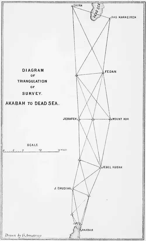 The means of surveying adopted was, 1st: In the Mount Sinai work taking a broad base over twenty miles long on Sir Charles Wilson's surveyed country; positions were fixed by observation, and a chain of observations were kept through to 'Akabah. 2nd. At 'Akabah a base line was measured, and the former work connected with it. A triangulation was then extended up the Wâdy 'Arabah until, at Ras Zuweirah and Kusr Sh. Ali, it joins on to the old triangulation of Palestine proper.