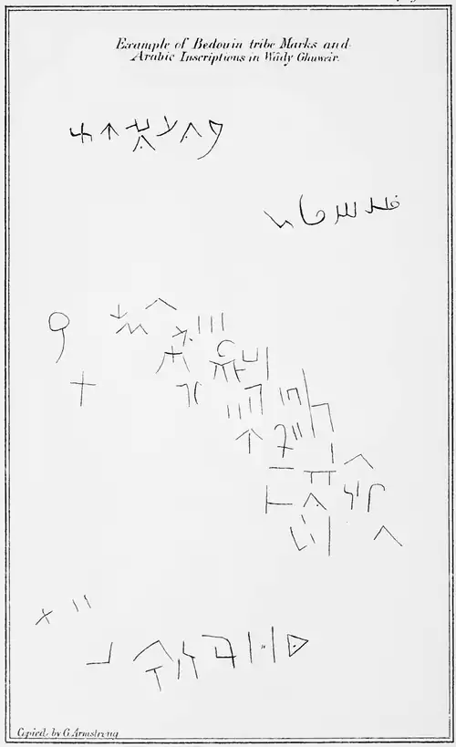 Armstrong explored the country towards the east, and found, six miles north-east of Fiddân, the ruins of a small town in a valley, surrounded by bold and precipitous cliffs; the ruined walls are from a foot to 3 feet high, the stones roughly squared, and of no great size; some black heaps resembling slag heaps point out that very probably ancient mines may be found in the neighbourhood. A path leads from Wâdy 'Arabah to this valley, crossing the watershed into Wâdy Ghuweir, where it joins, leading up the valley in a south-easterly direction, a beaten and well-worn track: this was probably the pilgrimage road from Gaza to Mecca. Lower down in the wâdy (Wâdy Ghuweir) are numerous springs of sweet water trickling out of the bed of the wâdy; and in a narrow gorge the rocks are literally covered with Bedouin tribe marks, Arabic inscriptions, &c., the work of pilgrims on their way to Mecca.