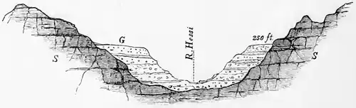 S Cliffs of red sandstone enclosing terraces of gravel, sand, and shingle (G) of the ancient Salt Sea (Bahr Lut), through which the valley of the River Hessi has been channelled out.