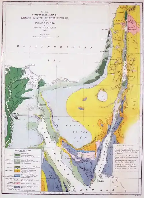 - ↑ Dr. Zittel states that although there is no definite line of division between the Cretaceous and Nummulitic formations of the Libyan Desert, the fossils of each formation are entirely different. It is probably the same in Arabia Petræa.